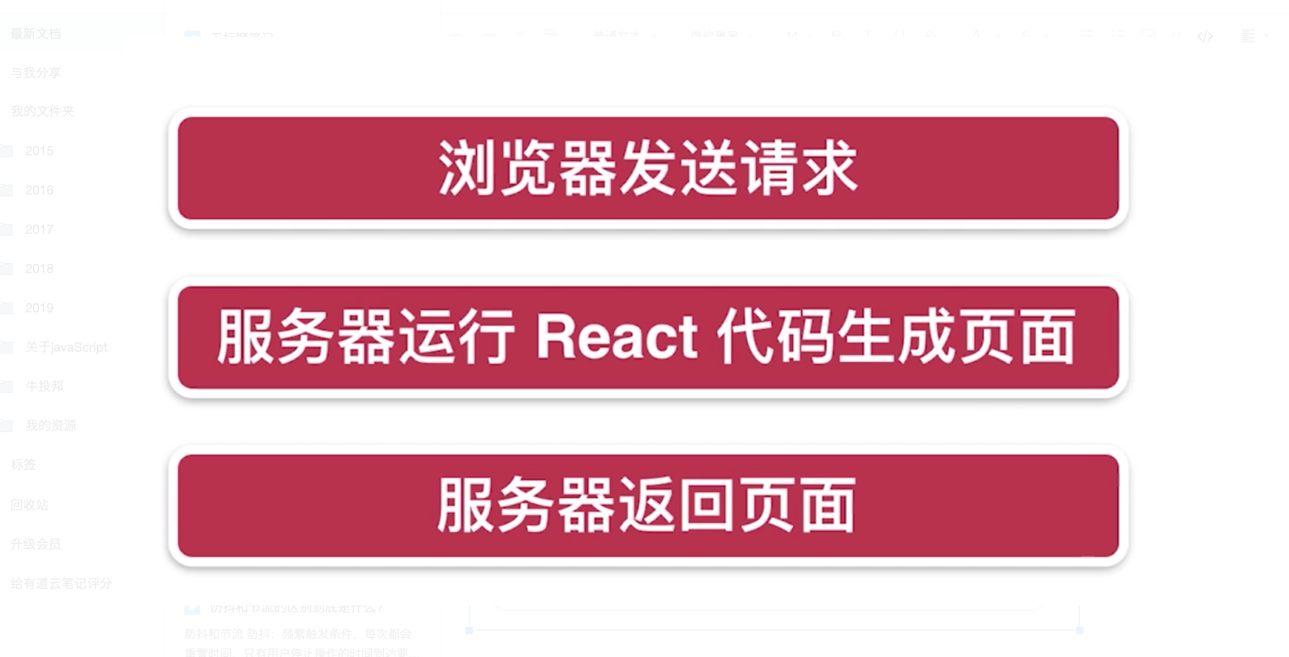 - SSR是由服务器直接返回已经生成好的HTML文档。正是因为服务器端只能返回HTML,而用户的点击事件需要的Js操作,还是要在浏览器端加载的。